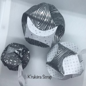 Elles sont réalisées avec la même collection de papier « Endroit paisible » , j’y ai rajouté un petit ruban pour les suspendre dans le sapin .